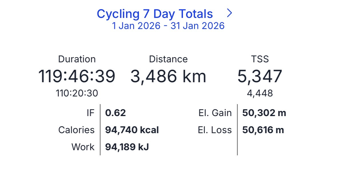 January really was my biggest month ever on the bike 120 hours or 3,486 km.